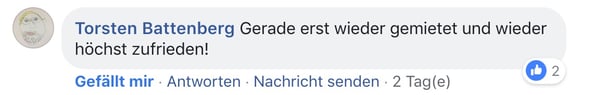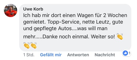 "Ich war sehr mit dem Leihwagen zufrieden. Das Preis-Leistungsverhältnis ist total klasse und das Auto in einem Top-Zustand. Service und Mitarbeiter sind sehr nett. Vielen Dank, jeder Zeit wieder."